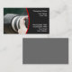 Photographer business card with photo of a person holding a very large camera lens and camera. Can be used by photographer, videographer, event planner, or studio. You could also use this as a wedding photography business card, or any other kind of photographer.