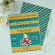Santa Claus holding a camera, two elves, peppermint candy and balloons decorate the page on turquoise and orange