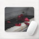 Artistic looking photo of an old piano focusing on the old yellowing keys with a faded red rose sitting on the keys and a few loose petals scattered about. This image has a somewhat melancholy and sentimental mood with a little bit of a nostalgic feel.