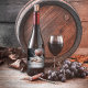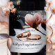 Romantic wine label featuring rose gold wedding bands on a piano, with a gorgeous magnolia flower and festive light sparkles.