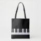 Fun black and white piano player's tote bag, featuring a piano keyboard design on a black background.