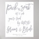 Pick A Seat Not A Side wedding sign print with silver foil effect (faux, printed as an image) and customizable text - you can add bride's and groom's name and wedding date. Dimensions of the sign print (poster) are 16 inches by 20 inches.