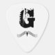 Pick that includes in the front the silhouette of guitar pick with a stylized rose and the flight of a swallow and in the back a monogram easy to update. The colours used are grey, black and red.