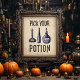 Let guests know where to get their drink on with our Pick Your Potion Halloween party sign. The cute Halloween poster features black watercolor bottles with potions such as wolfsbane and eye of newt and the words "Pick Your Potion" against a vintage paper background. Use the poster for your Halloween party's drink station or simply frame and use as home decor.