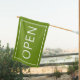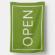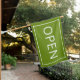 Colorful Vibrant Pickle Green Minimalist Modern Open Sign Small Business Double-Sided Flag — Simple olive pickle green colored minimalist weatherproof flag with clean white colored text in a clean and modern sans serif typeface for your small business, shop, boutique, bakery, bistro, restaurant, coffee shop, dispensary, market, thrift store, massage parlor, dog grooming or pet daycare facility, hair or nail salon, or anything else that needs an eye catching boost to let potential customers know they're welcome to come on in.