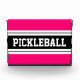 This sporty design features athletic PICKLEBALL text inside a highlighted wide black stripe with adjoining double white racing stripes against a bright pink background. The colors and text in this design can be personalized.