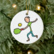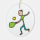 Pickleball design features expert player at full stretch with pickle ball and bat.
