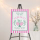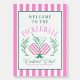Welcome your friends to a fun day of pickleball and cocktails with this beautiful party welcome sign. This pickleball themed sign has a line art image of pink and white striped pickleball paddles and a martini cocktail surrounded by laurel branches. There is a coordinating pink and white pattern on the front and back. Colors used include green and pink.