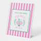 Announce the signature drink for your pickleball party with this cute sign. This pickleball themed sign has a line art image of pink and white striped pickleball paddles and a martini cocktail surrounded by laurel branches. There is a coordinating pink and white pattern on the front and back. Colors used include green and pink.
