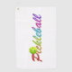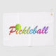 A colorful design featuring the word 'Pickleball" in shades of red, yellow, green, blue, pink and purple on a contrasting white background. Makes a great personalized gift for any pickleball enthusiast.
