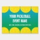 Pickleball event yard sign for a tournament, league or anything pickleball related. The design includes a row of yellow pickleball balls at top and bottom edges and a blue-to-green gradient background. Customize all text for your event.