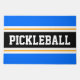 This sporty design features bold PICKLEBALL text inside a highlighted wide center black racing stripe with adjoining double white and yellow stripes and bright blue outer stripes. The colors and text in this design can be personalized.