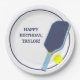 Throw the perfect court-side birthday party. These paper plates are ready to be personalized with your own custom message in navy blue letters which appears beside my realistic style illustration of a pickleball paddle and ball in navy blue, light blue and bright yellow.