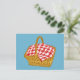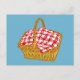 A stylized image of a picnic basket. Imagine the delicious food contained in this cute picnic basket with red and white checkerd cover.