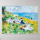 An impressionist painting of a family enjoying a picnic by the sea. The lush green meadow, ocean breeze, and soft sunlight create a serene outdoor scene.