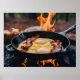 Picnic Perfection: Bacon and Eggs Fried in a Cast Iron Skillet Amidst Nature. This mouth-watering scene captures the essence of outdoor cooking with eggs and bacon sizzling over an open fire