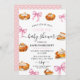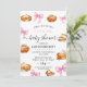 This darling invitation captures the perfect blend of autumn warmth and feminine sweetness. Beautiful watercolor illustrations of pumpkin pies sit alongside satin-pink ribbons and bows, all set upon a soft color palette of blush pinks, creams, and warm neutrals. The design is ideal for welcoming a little girl, evoking a feeling of home, harvest, and heartfelt celebration.