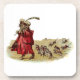 A cat playing a pipe, is leading all the mice and rats out of town in this antique illustration from a 1901 children's book. The cat is wearing a red cape and a jaunty hat with a feather in it.