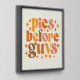 This fun and cheeky fall-themed design features the playful phrase "Pies Before Guys" in a bold, retro-inspired font. The text is arranged in a compact, stacked layout with each word in a different font style, creating a dynamic and eye-catching composition. The color palette includes warm autumnal hues like deep oranges, rich browns, and golden yellows, perfectly capturing the cozy vibes of the season.