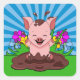 Cute pink baby pig happily playing in a pool of brown mud. Behind him are some colorful flowers, green grass and a blue sunburst sky.