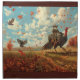 Happy Thanksgiving humor! An American pilgrim rides a large turkey like a cowboy, while a couple others fly on turkeys in the crisp autumn air filled with falling leaves. This surreal scene was created as a naturalist watercolor painting with a bit of AI assistance. Keep it funny this Thanksgiving holiday!