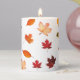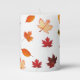Imagine a pillar candle adorned with the rustic charm of autumn leaves, perfect for bringing the cozy warmth of the season into your home. The candle itself is a rich, earthy color, reminiscent of the hues of autumn foliage. Encircling the base of the candle is a delicate wreath of dried leaves, carefully preserved to retain their vibrant colours and intricate textures.