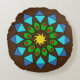Colorful Mandala on brown background. Triangles in two shades of blue are at the outer edge of a circle. Inside are green ovals with red dots. The center is a yellow sun shape with radiating arms. Same image on both sides.