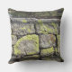 Stone wall with green moss. Stacked stones showing shadows in the sunlight. Green and red lichen (moss) grow on the surface of the stones.