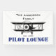 Design features a simple, minimalist sign which contains a black outline on the border, Family's Name, an image of a biplane airplane, an established date, and the text 'PILOT LOUNGE'. Perfect present for the pilot's office.