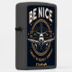 This striking gold-accented lighter sends a bold reminder from the runway: “BE NICE — I MIGHT BE YOUR PILOT SOMEDAY.” The design is centered on a detailed airplane flying head-on, framed by radiant golden lines, stars, and lightning bolt streaks that echo power and precision. Surrounding the aircraft is a circular vintage-style burst design, adding depth and movement. The top half features strong retro-styled “BE NICE” lettering in a warm cream hue with shadowing, while the curved text beneath completes the message with elegance and impact. The black background creates high contrast, allowing the metallic gold and cream tones to pop, delivering a professional yet humorous pilot’s statement. At the bottom, the custom signature is stylishly placed in gold script for a personal touch. A perfect lighter for aviation students, future captains, or anyone who loves the skies with a little sass.