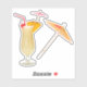 Custom-cut vinyl sticker with an image of a yellow cocktail umbrella and a pina colada in a tall stem glass garnished with a cherry, a slice of pineapple, a red straw and a pink cocktail umbrella. This sticker compliments our “Pina Coladas” greeting card and is a great finishing touch for sealing the envelope. See matching rectangular sticker, greeting card, confetti, favor tag and wrapping paper. See the entire Tubular 80s Sticker collection in the INVITES | Stickers & Labels section.