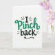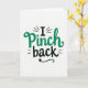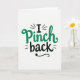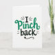 This card features the phrase “I Pinch back” centered on a bright white background, with “Pinch” in emerald green lettering that curves smoothly and looks slightly raised. The green word sits between a black “I” on the left and a black “back” on the right, creating a crisp contrast that feels flirty and teasing, like a friendly dare between close friends. A faint shadow under the green letters helps them stand out, as if they’re gently hovering above the page. Small radiating lines around the words add a quick burst of energy, like a wink across the room on St. Patrick’s Day 💚. The text stays in the middle of the front, with the green “Pinch” as the main focus and the black words acting like a confident reply. The tail of the “k” in “back” curls into a little flourish that ends in two tiny dot tips, almost like antennae ☘️. The overall look is simple and high-contrast, with white space surrounding the centered lettering and the green-and-black design kept tight and tidy.