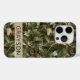 Customize this pine and leaves camouflage iPhone 15 pro case with your name in a trendy modern CAP font in brown on opaque cream. It's masculine and perfect for your favorite military, hunting, country or outdoorsman!