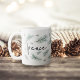 Modern and festive holiday mug design features "peace" in chic handwritten lettering, surrounded by watercolor pine bough illustrations in spruce green.