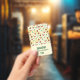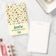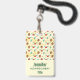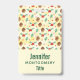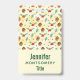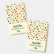 A name tagwith a cute Christmas pattern featuring pine cones and holly on a yellow watercolor background with little white circles scattered around.
