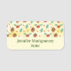 Name tag with a cute pattern featuring pine cones and holly on a yellow watercolor background with little white circles scattered around.