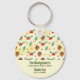 Christmas party (or other event) thank you favor key chain with a cute pattern featuring pine cones and holly on a yellow watercolor background with little white circles scattered around.