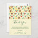 Thank you postcard with a cute pattern featuring pine cones and holly on a yellow watercolor background with little white circles scattered around.