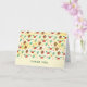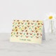Thank you card with a cute pattern featuring pine cones and holly on a yellow watercolor background with little white circles scattered around.