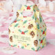 Small favor box with a cute Christmas pattern featuring pine cones and holly on a yellow watercolor background with little white circles scattered around. Merry Christmas written inside a yellow rectangle, layered over top.