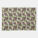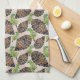 This kitchen dish towel features a repeating pattern of pine cones and pine branches.