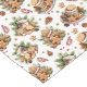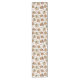 This fun Christmas table runner has a repeating pattern of stacked gingerbread cookies in many shapes, along with candy canes, gold stars, and pine cones. The images are placed on a white background. Appealing to kids of all ages for the Holiday season!