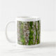 Vibrant green moss grows in vertical grooves of faded pine tree bark. The macro photograph shows the alternating stripes of bark and moss as well as the texture of each. The bark is layered, scaly, with fine gradations of color: grays, browns, and even pale green. The moss is comprised of myriad short fine hairs, as though the tree wanted some green fur highlights.