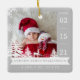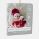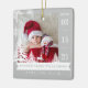 New baby birth stats photo Christmas ornament. The design features two photos, one photo on the front and one on the back. Display your new baby's photo. The date of birth is displayed along the side and the baby's name and birth stats along the bottom. A Grey background with white snowflakes, pine trees, and deer is added along the bottom of the photo. **Please note you can change the background color by clicking on edit using the design tool. The reverse side features a place to add a second photo. White snowflakes, trees, and deer are added as well. design by Moodthology Papery