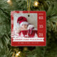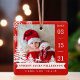 New baby birth stats photo Christmas ornament. The design features two photos, one photo on the front and one on the back. Display your new baby's photo. The date of birth is displayed along the side and the baby's name and birth stats along the bottom. A red background with white snowflakes, pine trees, and deer is added along the bottom of the photo. **Please note you can change the background color by clicking on edit using the design tool. The reverse side features a place to add a second photo. White snowflakes, trees, and deer are added as well. design by Moodthology Papery