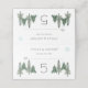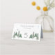 Elegant folded place card with illustration of pine trees in watercolor style. Inside card - falling snowy background.