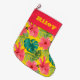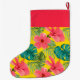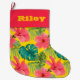 Exotic hibiscus flowers, monstera leaves and palm fronds on a bright yellow background, vividly printed and personalized any way you choose on these tropical theme Christmas stockings in two sizes. Choose from 3 different material styles. We've designed for double sided print, but you can choose a solid red back panel. (Red cuff on the top is PRINTED, not a separate piece and you can change the color.) **Personalize your stocking and add it to your shopping cart for each name you create.