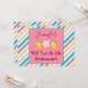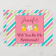 A unique way to ask your Bridesmaids to be a part of your wedding, this invitation features a lovely pink, green and blue diagonally striped background with a pink and blue box in the middle. The box has a template for customizing her name with "Will you be my Bridesmaid?" written in lovely burgundy font. Personalize yours today!
