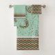 Add a custom touch to your rustic cabin bathroom with this bath towel set created with a pinecone pattern in shades of teal blue and brown and distressed chevron stripe accents. Choose the set or separate bath linen items in the dropdown menu.. See the bath the other coordinating items in this same design collection.