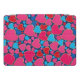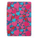 Vibrant, playful pattern of hearts in various colors, including shades of pink, red, and blue. These hearts are scattered throughout the composition in different sizes and orientations, creating a lively and cheerful appearance. The background is a deep navy, which helps the colorful hearts stand out.